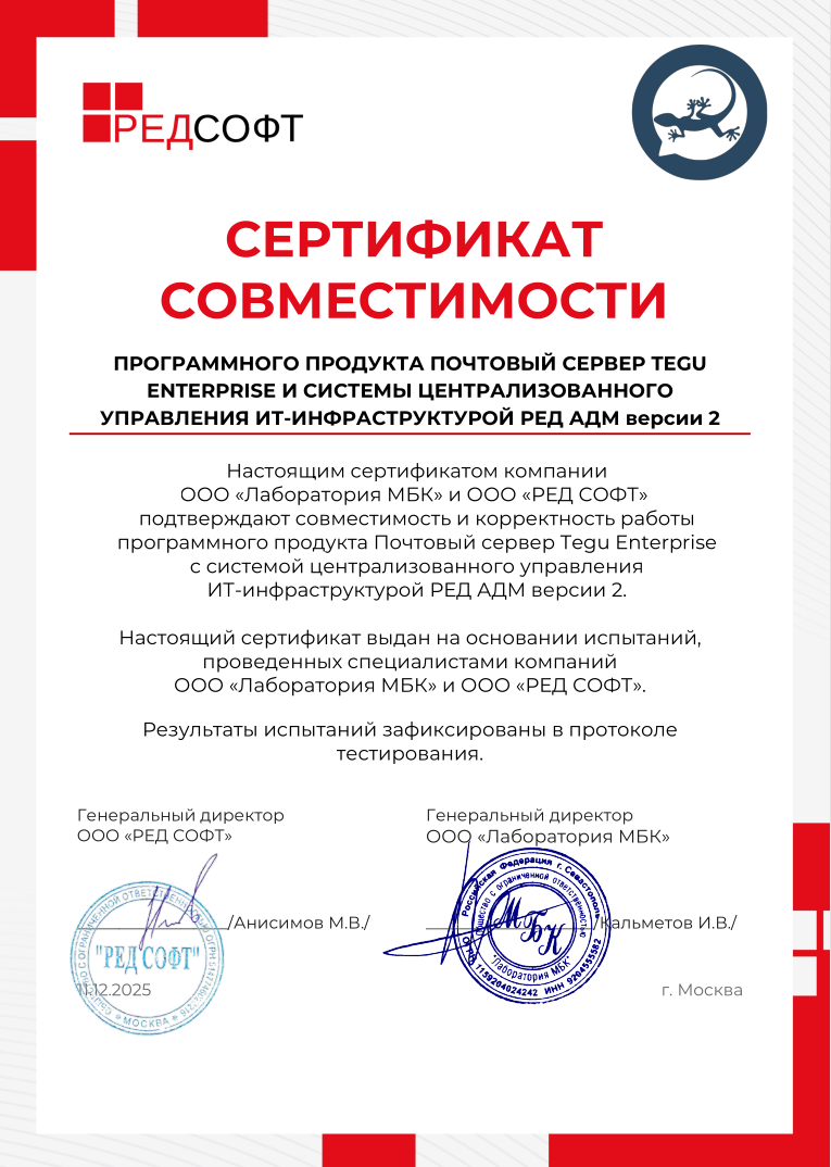 Компании ООО «Лаборатория МБК» и ООО «РЕД СОФТ» подтверждают совместимость и корректность работы программного продукта Почтовый сервер Tegu Enterprise с системой централизованного управления ИТ-инфраструктурой РЕД АДМ версии 2.